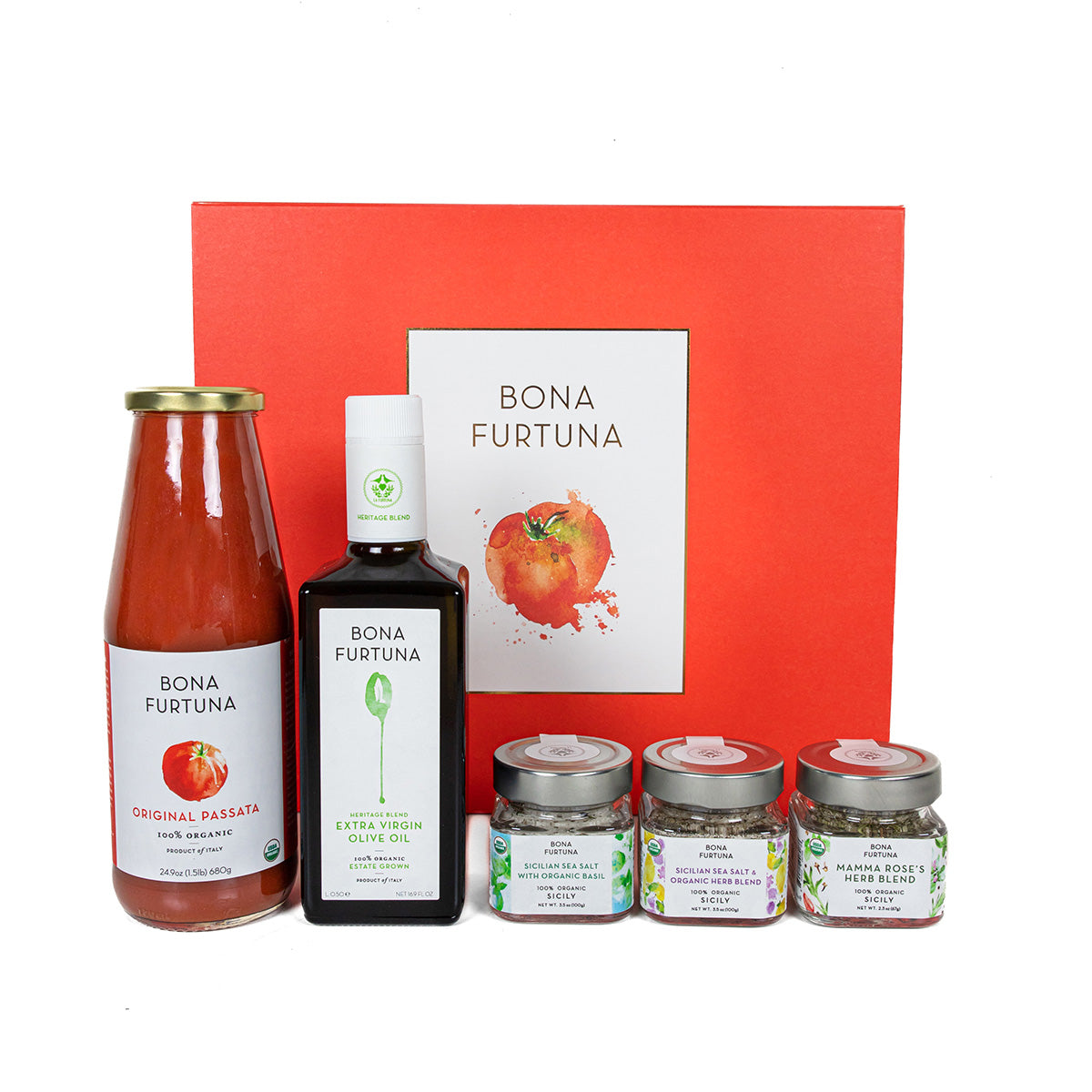 Bona Furtuna The Sicilian - Olive Oil Gift Set with Marinara Pasta Sauce, Sea Salt, Basil and Herbs - italian gifts - sicilian gifts