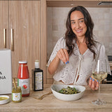 • Woman enjoying a meal with a glass of wine in a kitchen setting - italian food subscription box