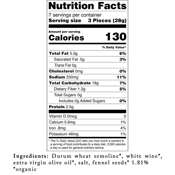 Our classic taralli recipe with fennel folds herbaceous seeds straight into a savory extra virgin olive oil dough. With every enticing bite of these gourmet crackers, the sharp and distinctive anise flavor of fennel bursts to life in your mouth, and is gently rounded out by the sweet and earthy flavors of organic durum wheat. Serve our irresistible Fennel Seed Taralli alongside your favorite rye whiskey or use them to add a little texture to your next soup.